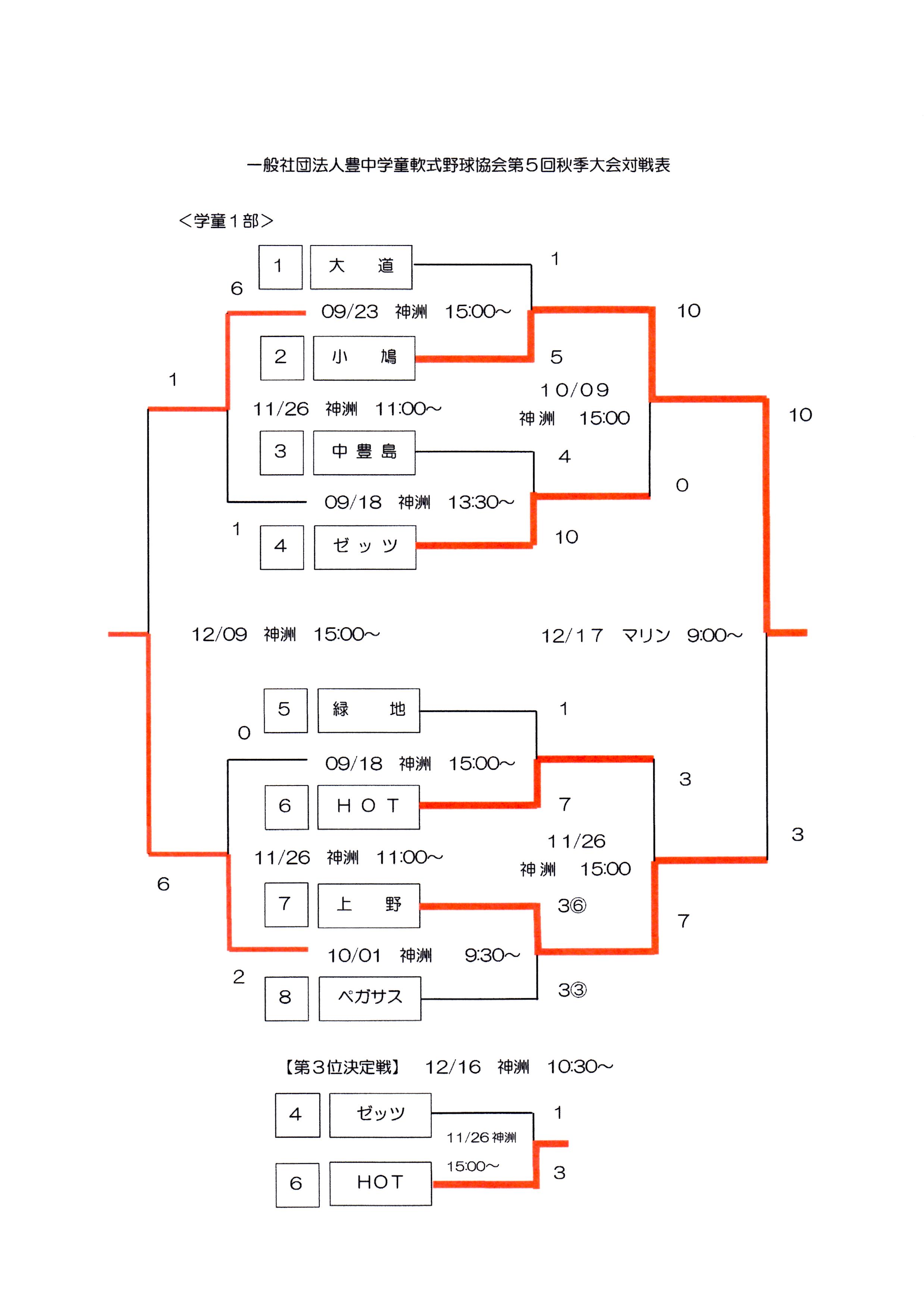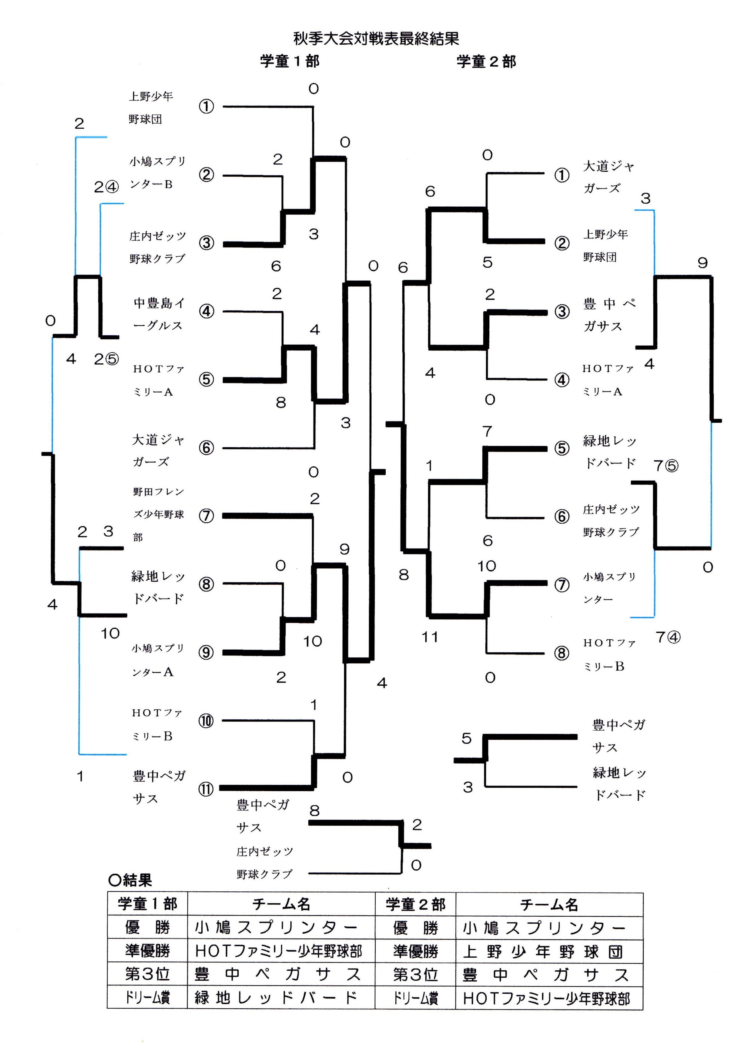 <成績> 学童1部 優 勝:小鳩スプリンター 準優勝:上野少年野球団 第3位:HOTファミリー少年野球部 ドリーム賞:豊中ペガサス